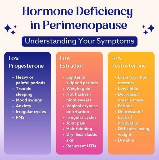 Dr. Christine Marenโs, article โPart III: Navigating Perimenopause: A Comprehensive Guide to Treatment Options and Lifestyle Strategies,โ also explains which perimenopause symptoms can be affected by which hormones. This chart from Dr. Marenโs website can be helpful with addressing perimenopausal symptoms in general.
